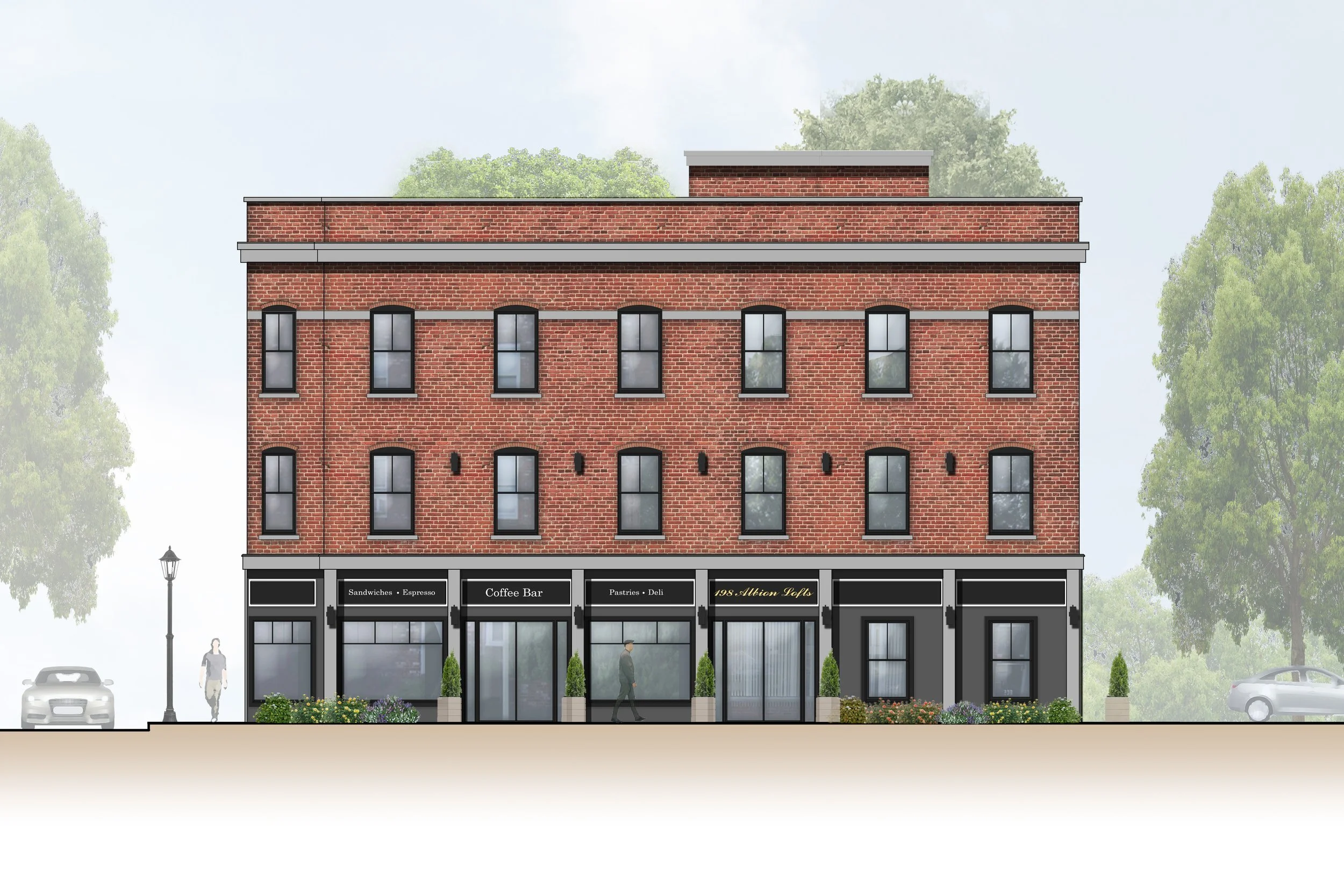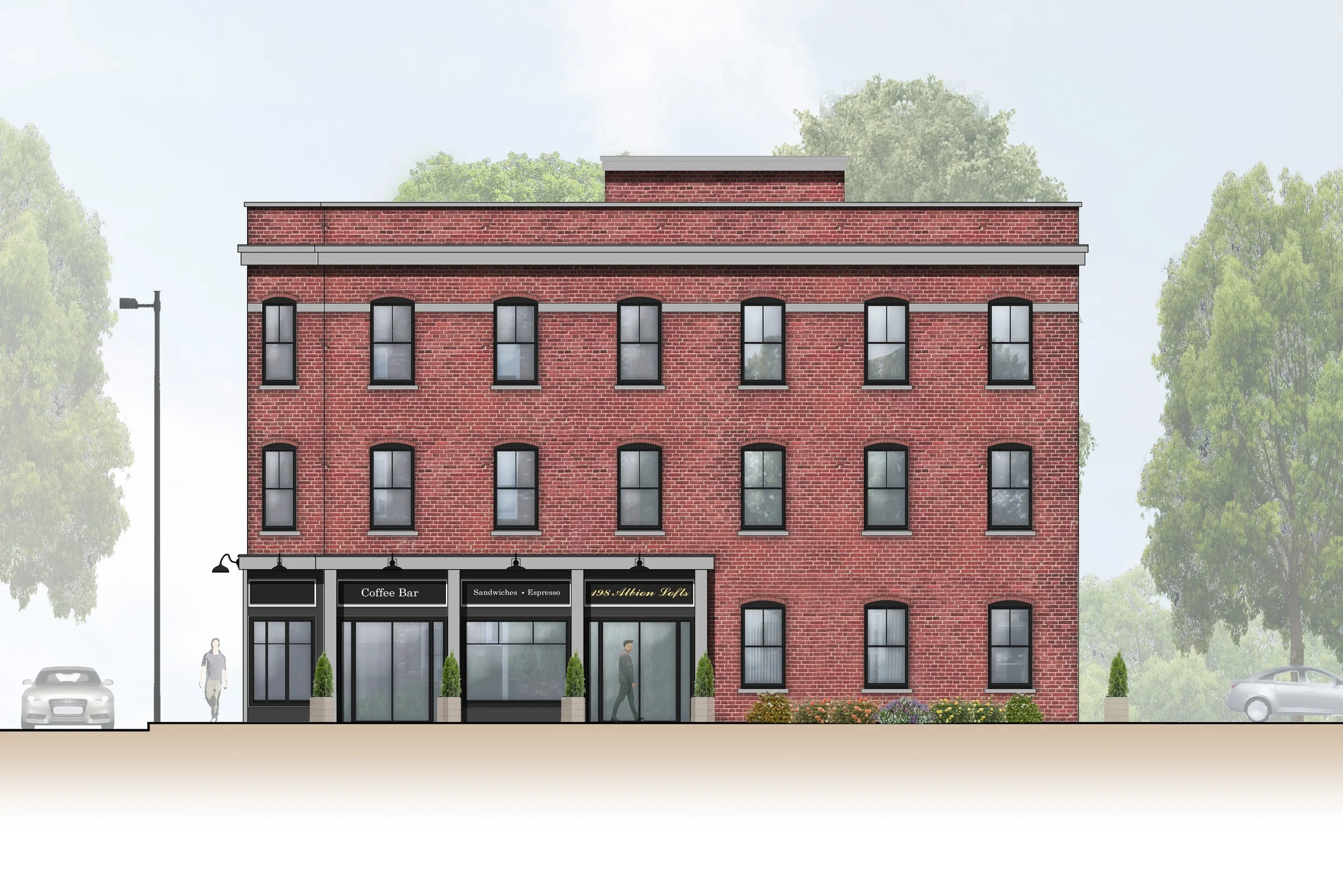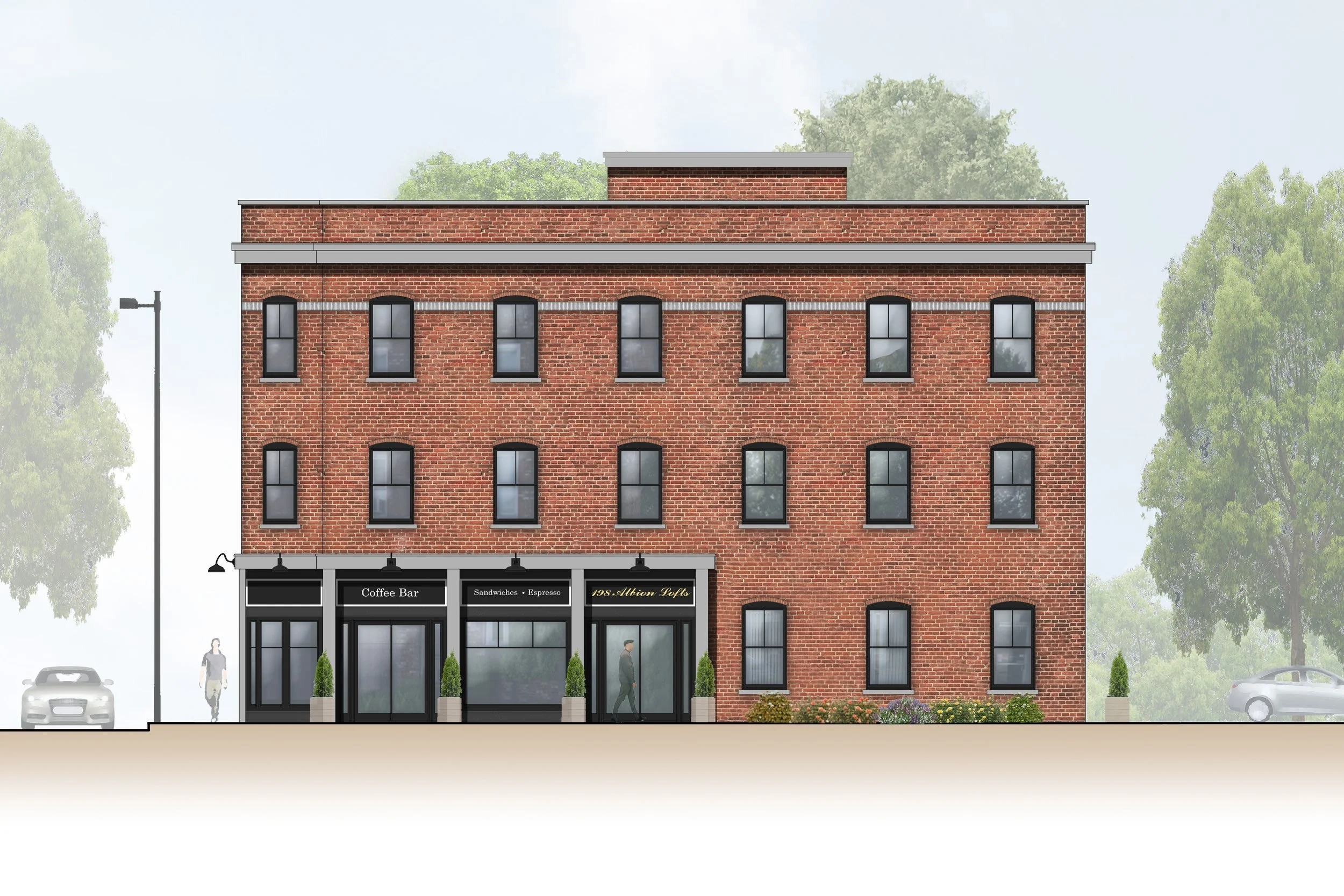 A low-profile banding detail at the ground floor separates the retail and residential spaces, complementing the upper soldier course that frames the third floor windows. Though some trim details were cut, a simple protruded brickwork pattern adds texture and definition to the upper parapet.